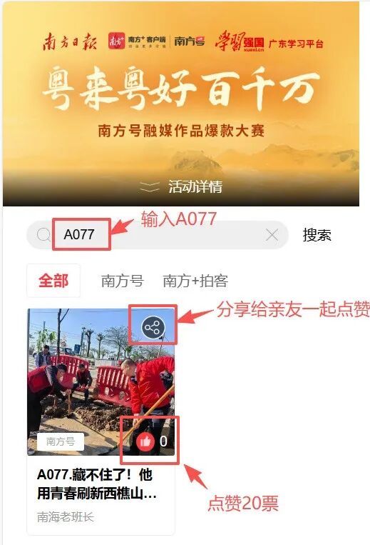 2.点击上文链接进入“粤来粤好百千万”展示界面后,搜索栏输入A077点击图片右下方点赞标志助力;也可点击图片右上角分享按钮转发邀请朋友、群友点赞。